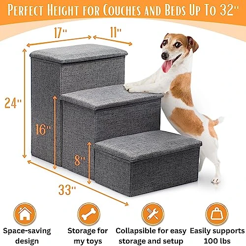 - 🧸 Store Toys & Treats Inside- These high bed steps for dogs to get on bed are ergonomically designed, with storage compartments inside the 3 steps. Put all your favorite toys, treats, leashes and more in here and reduce clutter!