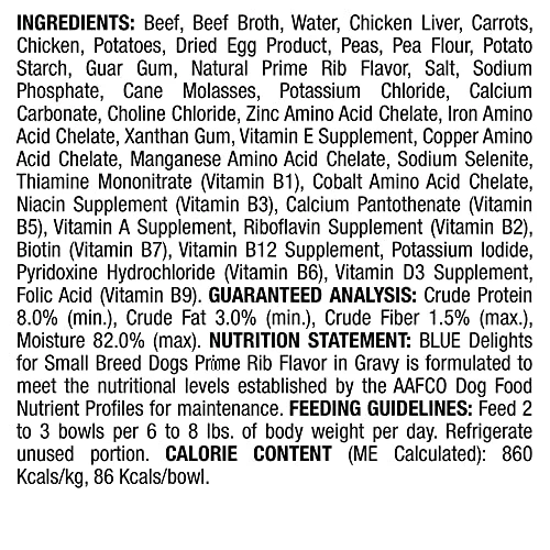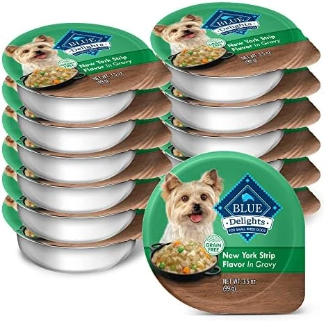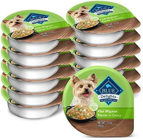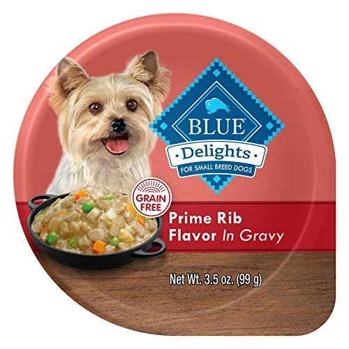 - Contains twelve (12) 3.5-oz BLUE Delights Natural Adult Small Breed Wet Dog Food Cups, Prime Rib Flavor in Hearty Gravy