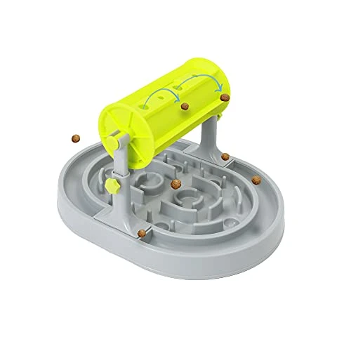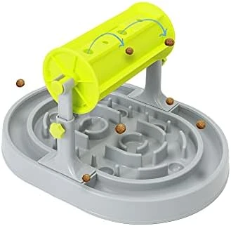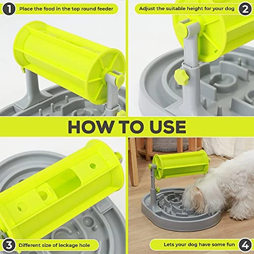 - HOW THIS DOG TREAT DISPENSER GAME WORKS: First the food is placed in the top round feeder. The dog must turn the slow feeder to get the food through the leakholes, then continue to search for food on bottom plate maze.