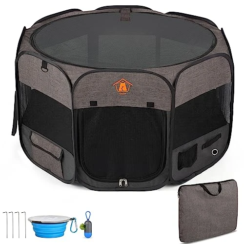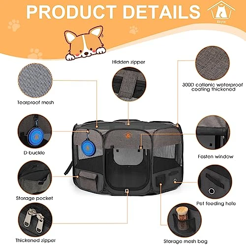 - 【BONUS INCLUDED】Ebyte Portable Pet Play Pen comes with a handy carry bag, a collapsible 16-ounce feeding bowl, pet waste bag and pet waste bag capsule case, making it ideal for travel.