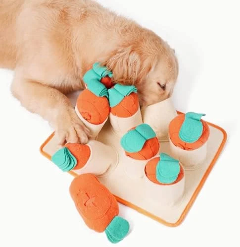 - Super Fun Design-Unlike the usual sniff mat for dogs, your dog needs to sniff and think at the same time to learn how to pull the plush carrots out to get the treats inside. Want to see how long your dog takes to pull all carrots out?