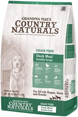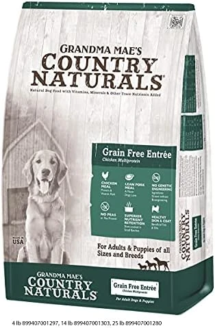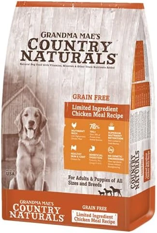 - Contains one (1) 4 lb Bag of Grandma Mae’s Grain Free Chicken Meal Dry Dog Food