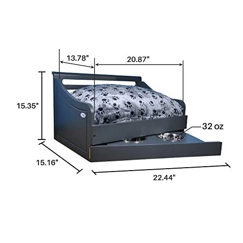 - Available in three models (antique Gray, Rustic brown and Charcoal Gray), cushion Dimensions: Small – 20×13 inches, Suitable for pets up to 30 lbs, bowl size: 32 oz each.