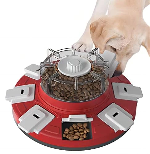 - 【Easy to Use】Dog puzzle toys have 6 flip type lids, you can add food to the granary, pets press down on the transparent lid, food will fall into the leaky food-box. Pets also can eat food by moving 2 sliding lids. In the beginning, you can try helping your pet to smell and find food with its paw.