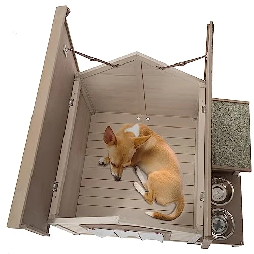 - Extra Large Space:The spacious porch, Covered storage box and raised feeding area with two stainless steel feeding bowls that expands the dog house by a long shot.