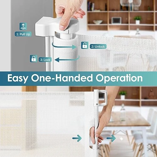 - Easy One-Handed Operation: Our retractable baby gate with door features a one-handed locking and unlocking mechanism, allowing you to easily operate it. Once locked, the pet gate for cats securely closes to prevent babies and pets from accidentally opening it.
