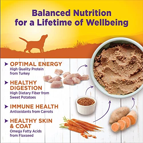 - TURKEY & SWEET POTATO: This natural wet food for adult dogs features real turkey and sweet potato for complete, balanced nutrition. Pate texture is completely smooth for an irresistible taste your dog will love.